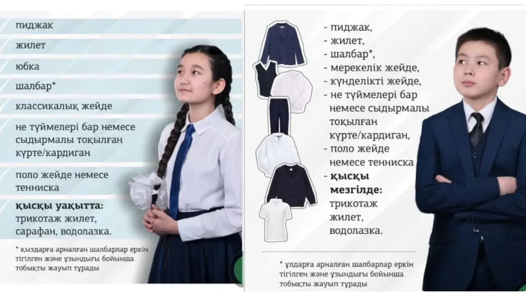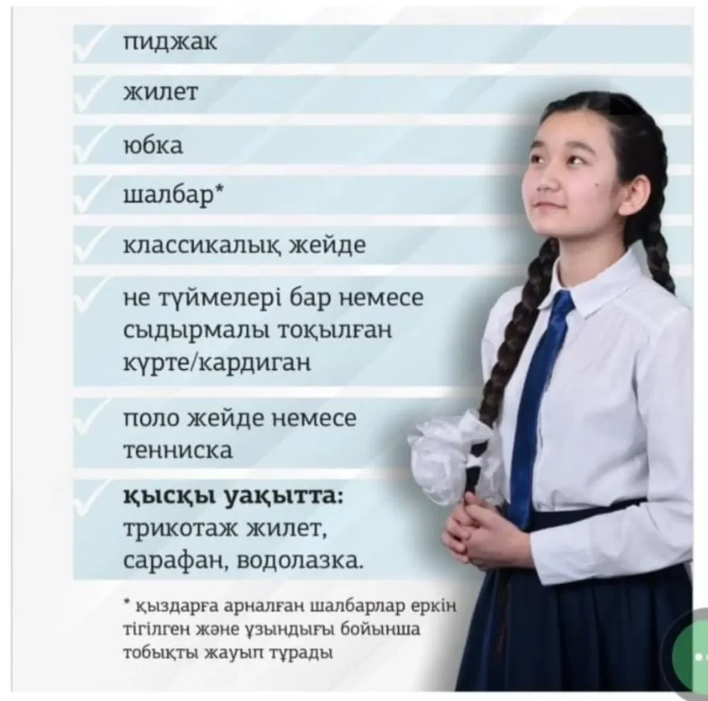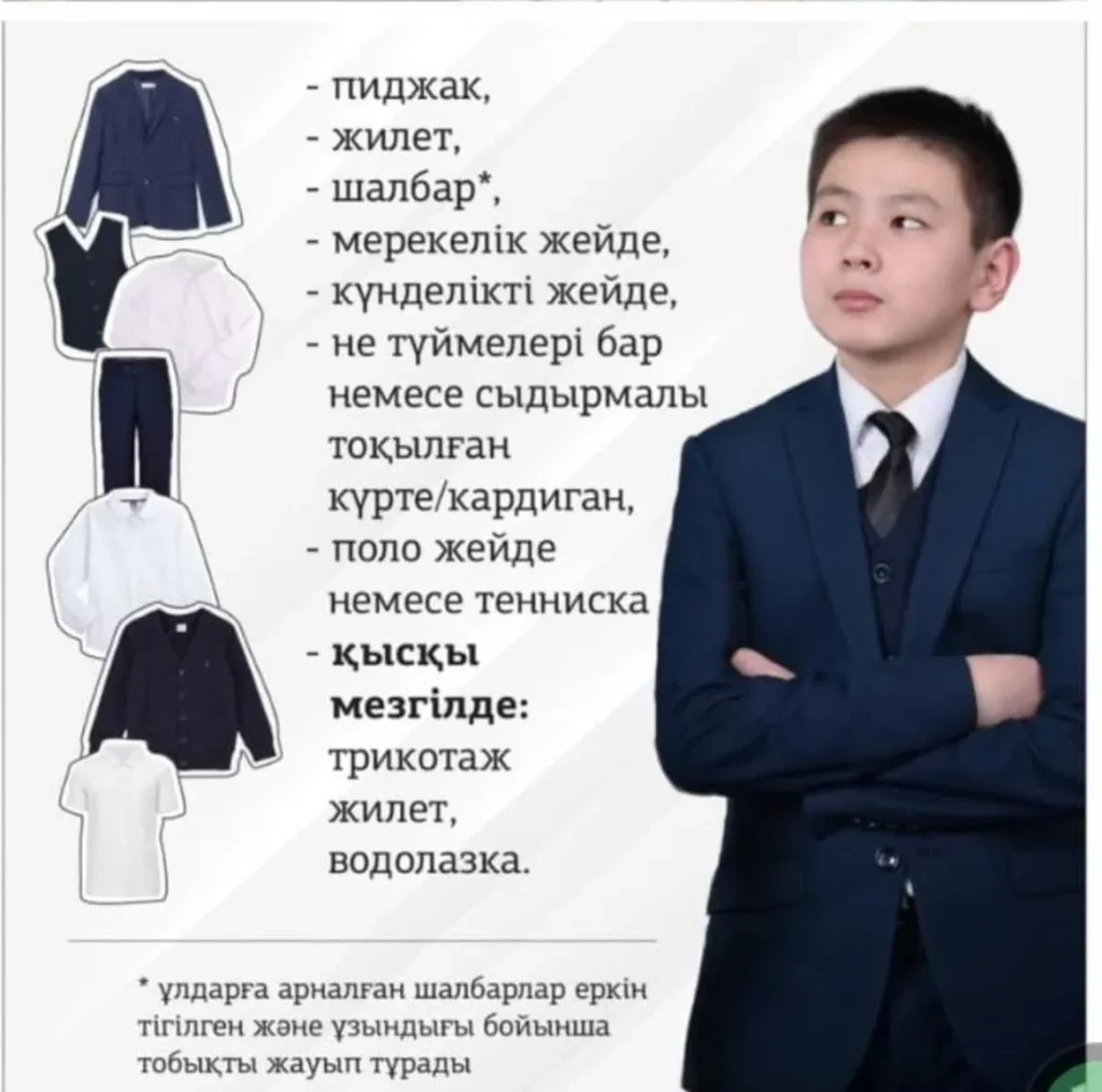 4) Мектеп формасына түрлі діни аксессуарлар, джинсы, слакси шалбарлар, тениска, футболка, қысқа, тор, кожа юбкалар сияқты қатысты киім элементтерін қосуға болмайды.